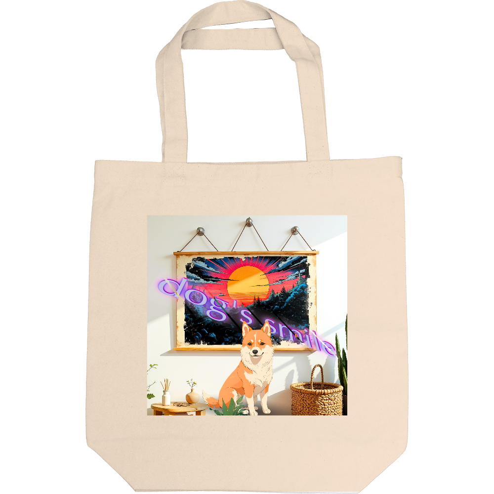 室内でたたずむ微笑んでいるような犬をモチーフにデザインしました。