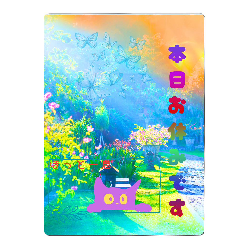 落ち着きのある庭を背景に日本語テキスト文字、猫のシルエットをコラボしたデザインです。